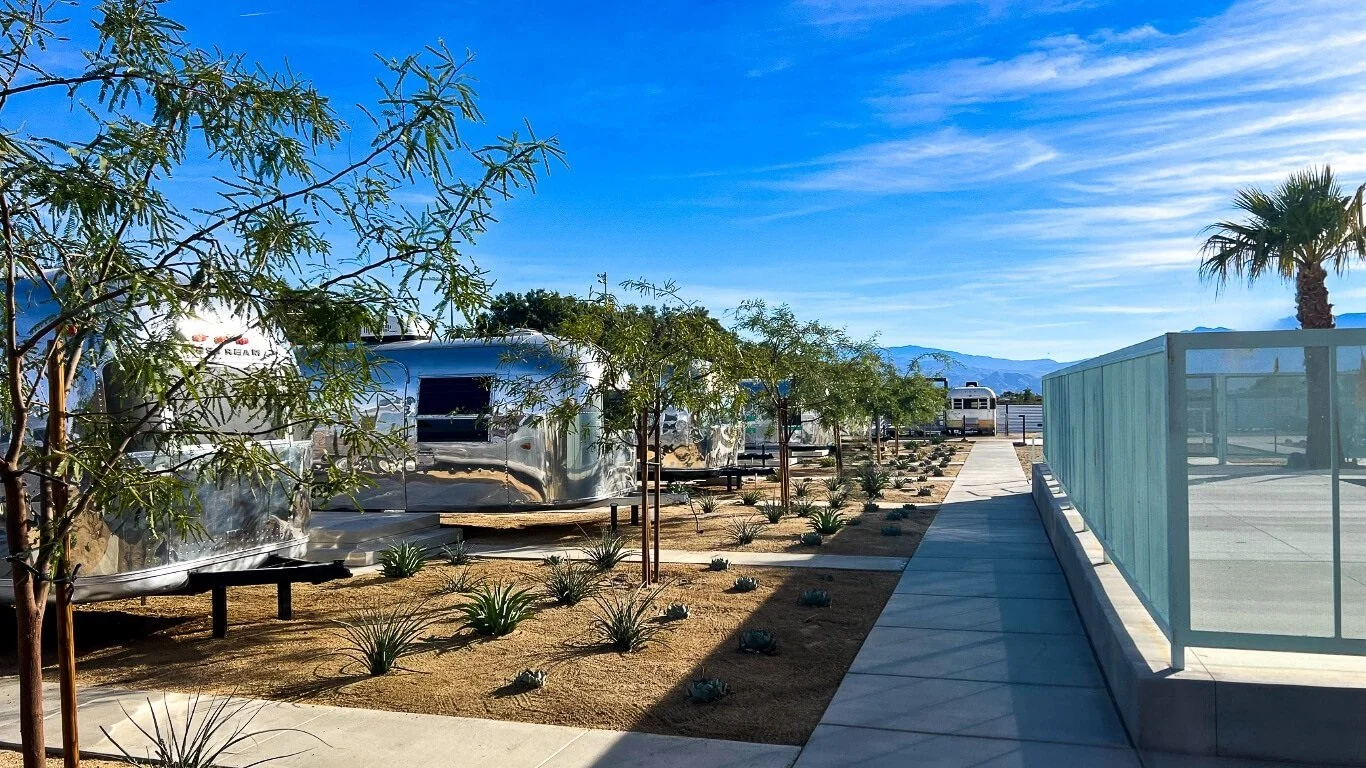 Lodge in comfort and style with private Airstream units available for yoga retreats in Desert Hot Springs, California. Each unit comes with private bathroom, kitchen, dining and lounge space along with private warm mineral springs outdoor tub.